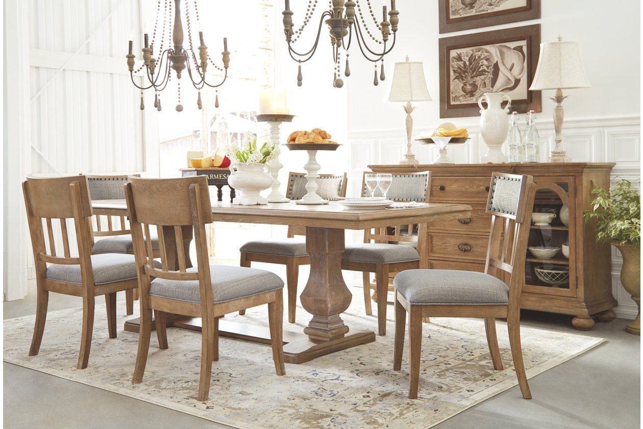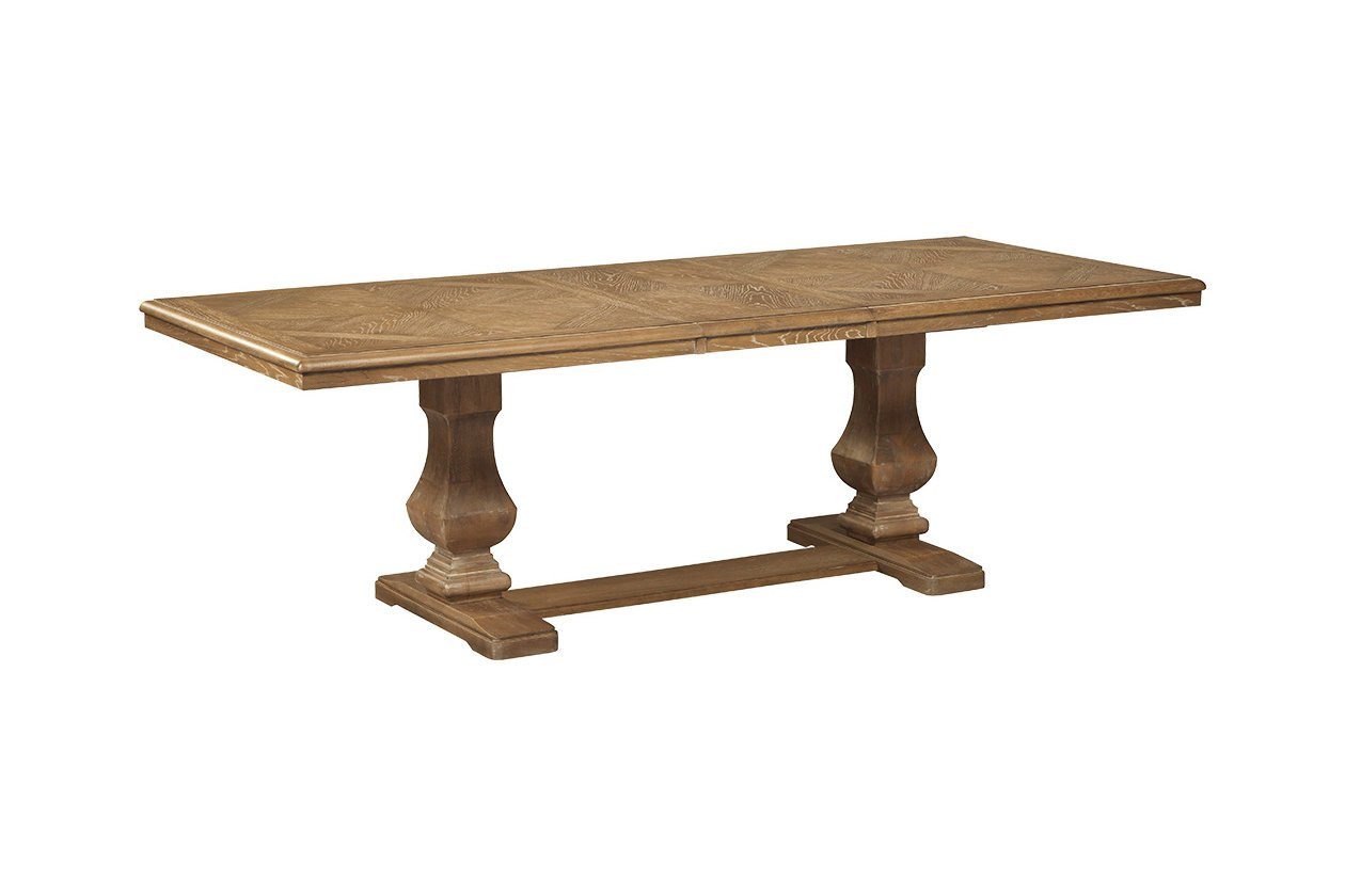 BrownLuring with an easy-on-the-eyes finish inspired by the romantic beauty of aged oak barrels and wine country interiors, the Ollesburg rectangular extension dining table is indeed something to savor. A true labor of love, its inlaid veneer tabletop is supported by a double pedestal base with stretcher—for a sense of elegance with substantial presence.